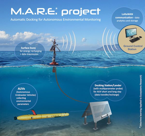 Il Progetto M.A.R.E. mira allo sviluppo di un sistema integrato per la raccolta di dati di natura ambientale da realizzarsi in modalità automatica senza stretta supervisione umana. Il monitoraggio verrà effettuato da una postazione fissa (Lander) e da un mezzo subacqueo autonomo (Autonomous Underwater Vehicle o AUV).